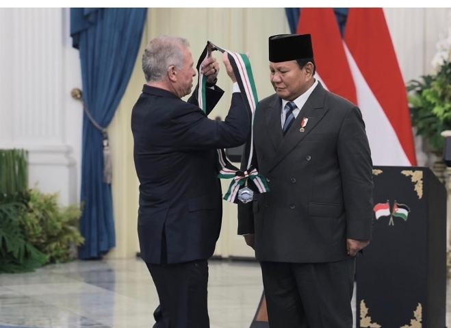 Menhan Sjafrie juga turut menyaksikan momen bersejarah ketika Presiden Prabowo Subianto menerima anugerah kehormatan “The Bejewelled Grand Cordon of Al Nahda (Order of the Renaissance)”. Penghargaan tertinggi Kerajaan Yordania ini disematkan langsung oleh Raja Abdullah II sebagai pengakuan atas kontribusi Presiden Prabowo dalam memperkuat hubungan bilateral, isu kemanusiaan, dan stabilitas kawasan.